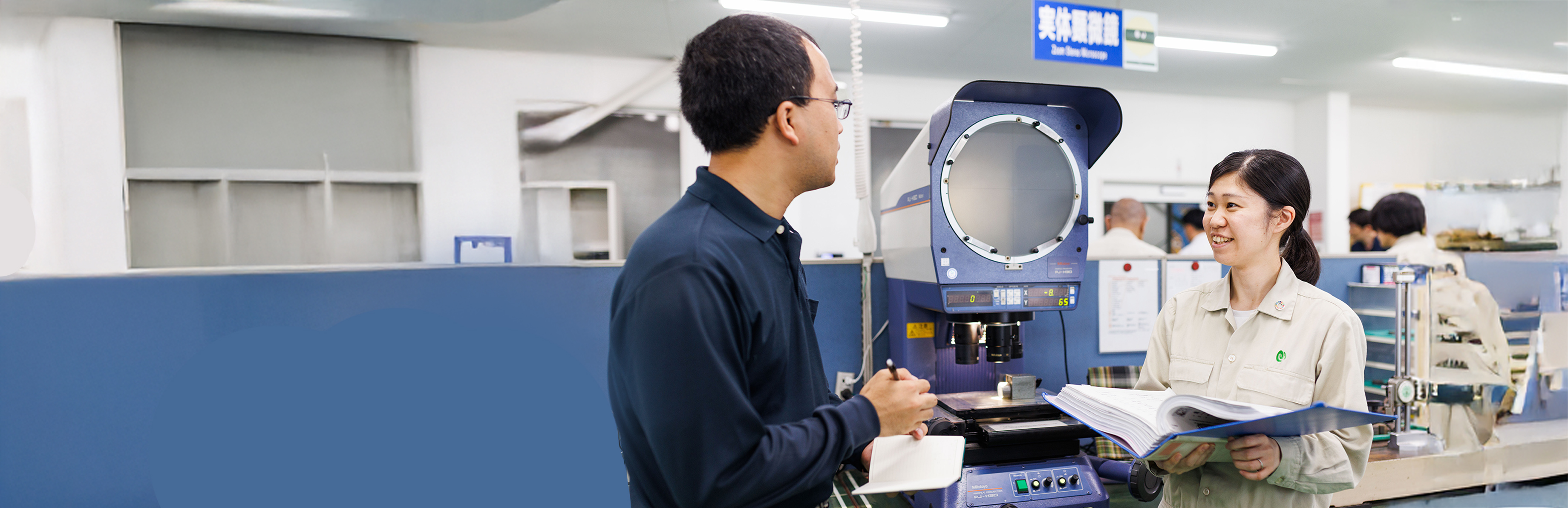 品質保証部は、お客さまからの問い合わせ対応や、社内で発生する品質問題に関する相談を受けて調査・改善、定期的な品質監視を担う部門です。製造部や営業部、現場のスタッフとの連携はもちろん、素材メーカーや部品メーカーとも密に情報交換を行い、品質の維持と向上に努めています。