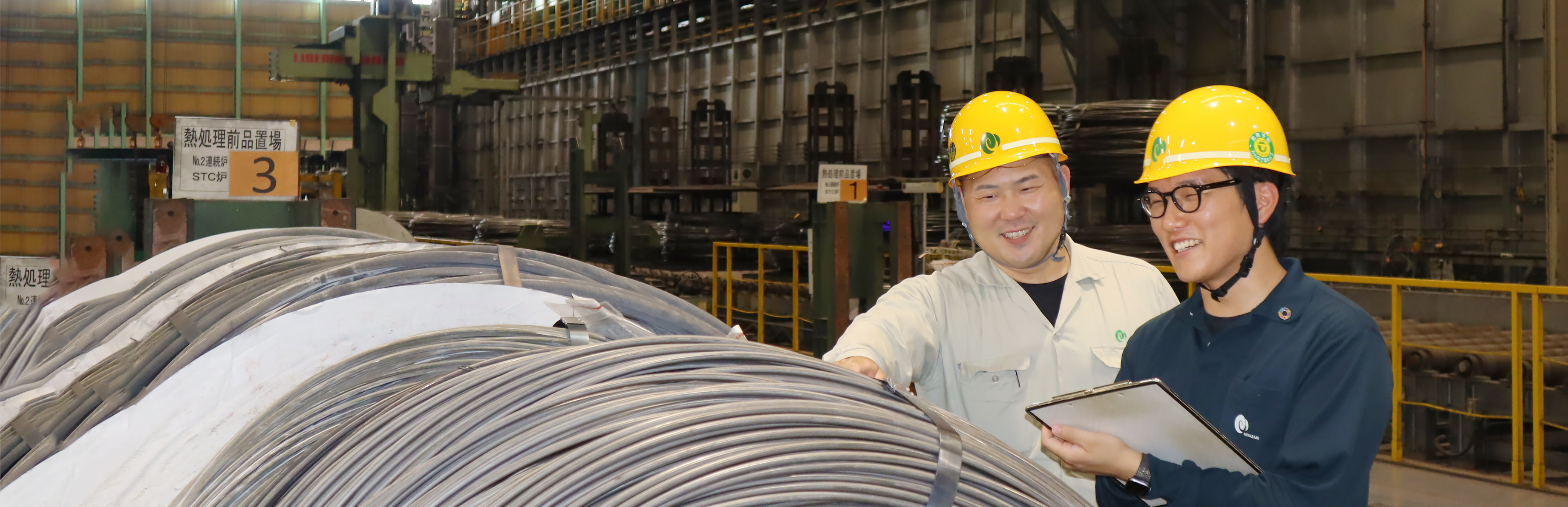現場では、酸洗(材料の黒皮除去や皮膜処理)、熱処理(熱を加えて加工しやすくする)、伸線(お客様の仕様どおり、線材の太さを整える)の3工程があり、それぞれに担当者と機械が配置されています。各工程で、作業の効率化や品質管理に努めています。ロットナンバーの管理や納品時の送り状発行など、事務的な業務も製造部が担当しているため、業務の幅は非常に広いといえます。